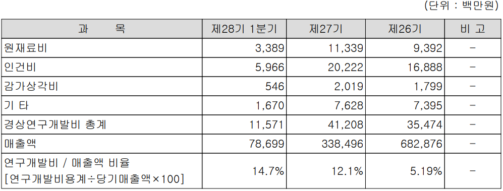 당사의 지난 1분기 연구개발 비용은 전체 매출액의 14.7%에 해당되는 116억 원 규모를 투입했습니다. 적지 않은 규모의 비용을 투자하면서 적극적으로 5G 시대를 선제 대응하고 있으나, 코로나19로 인한 투자 지연으로 어려움을 겪고 있는 상황입니다.