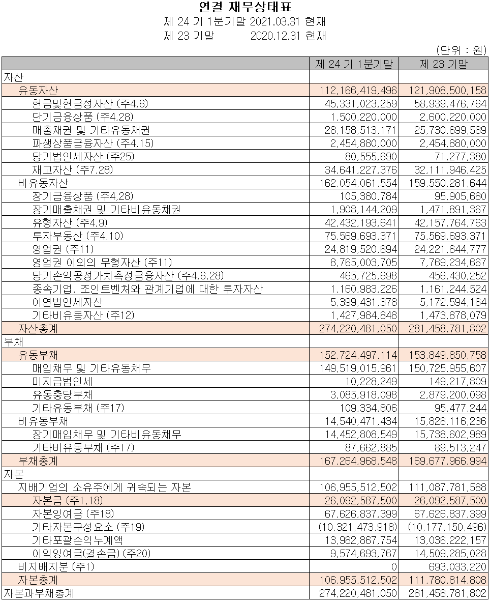 지난 1분기 자산 총계는 전기보다 2.6%(72억 원) 감소한 2,742억 원으로 현금 및 현금성 자산의 감소에 기인합니다. 부채 총계는 1.4%(24억 원) 감소한 1,673억 원으로 매입채무의 감소가 있었습니다.