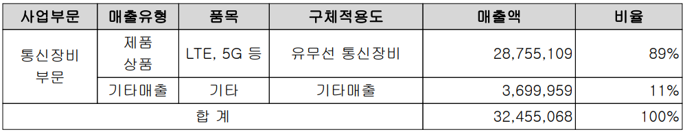 당사는 유무선 통신 장비를 제조, 공급하는 단일 사업부문으로 무선 통신시장과 유선 통신시장으로 구분됩니다. 지난 1분기 당사의 유무선 통신장비의 매출은 288억 원으로 전체 매출의 89% 비중을 나타냈습니다.