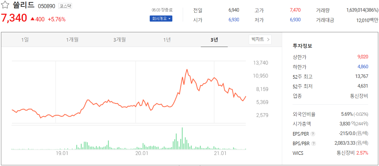 쏠리드 주가 3%↑...'美법인에 182억 규모 담보 제공' 소식에 상승세