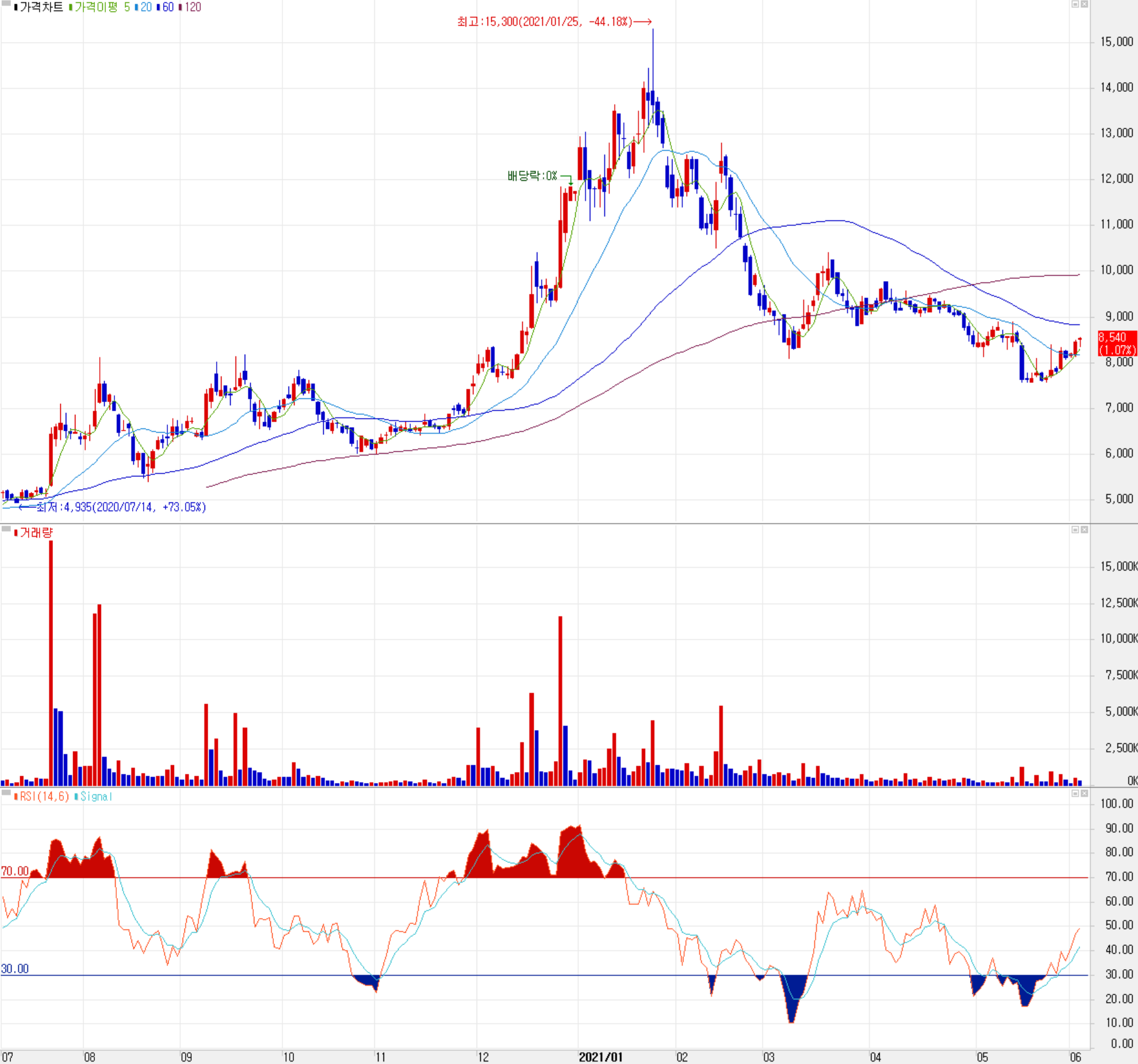 지난해 11월부터 주 고객사의 중저가 스마트폰에도 폴디드 줌 등 고사양 카메라의 탑재 소식에 주가가 상승하기 시작하면서 올해 1월 최고가인 15,300원을 기록한 후 시장 변동성이 확대되면서 하락세를 맞이했습니다. 최근에는 산업용 소재를 제조하는 제이월드 인수 소식 및 테슬라의 자율주행 차량에 카메라 모듈 장착 소식에 따라 주가가 완만한 반등을 시도하고 있습니다. 개인적인 목표주가는 지난 4월 분석글에서 설정한 목표주가인 13,000원에서 하향한 11,500원으로 하향 조정하고, 2분기 실적 발표 시기까지 유지할 예정입니다.