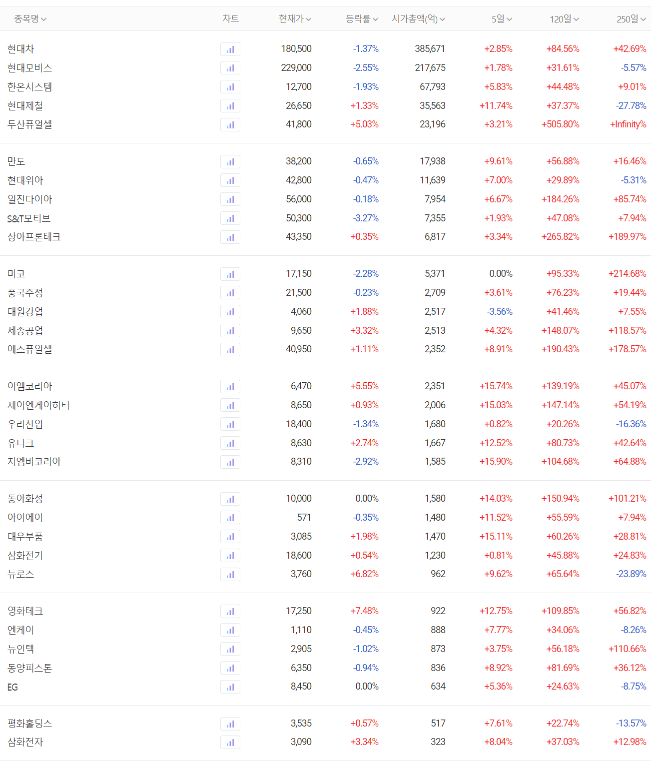 수소 관련주 중에서는 수전해 수소충전소를 구축할 수 있는 자체 기술을 보유한 국내 유일 기업인 이엠코리아가 15.74% 상승했고, 제이엔케이히터와 지엠비코리아등이 지난 5 거래일 동안 15% 이상 상승하면서 강세를 보이고 있습니다.