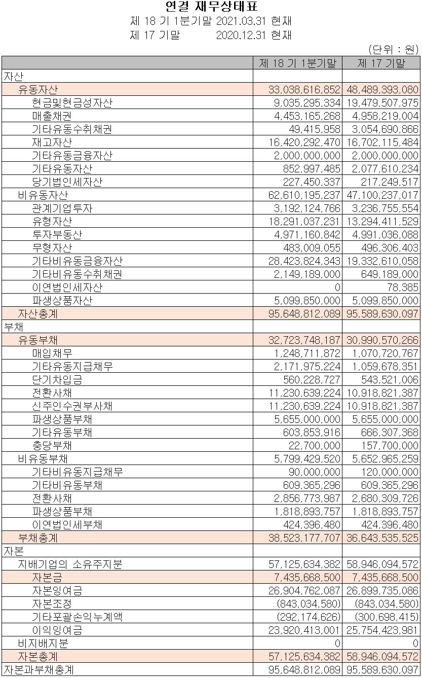 당사의 지난 1분기 자산총계는 전기보다 0.1% 증가한 956억 원이며, 부채는 5.1%(19억 원) 증가한 285억 원입니다. 유동성 지급채무 및 전환사채가 주요 부채 증가의 요인입니다.