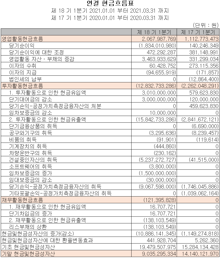 지난 1분기 영업활동 현금흐름은 운전자금의 변동에 따라 총 20.6억 원의 현금이 유입되었습니다. 부채를 상환하고 유형자산의 취득이 있었습니다. 2021년 1분기 말 기준 현금 및 현금성 자산은 전년 동기보다 51억 원 감소한 90억 원입니다.