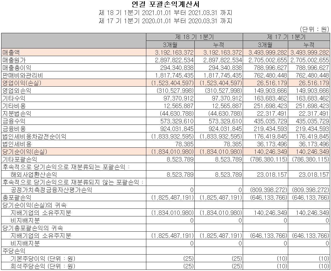 당사의 지난 1분기 실적에서는 매출액 32억 원으로 전년 동기 대비 8.6% 감소했고, 영업손실 15억 원, 당기순손실 18억 원으로 전년 동기 대비 적자 전환했으며, 전분기에 이어 2분기 연속 적자 지속입니다. 전반적인 매출 감소와 신규 사업인 바이오사업의 시설투자에 따른 비용 부담이 있었습니다.