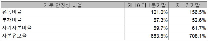 2021년 1분기 재무 안정성 비율에서는 유동비율 101%, 부채비율 57.3%, 자기자본비율 59.7%, 자본 유보율 683.5%를 기록하였습니다. 지난해 바이오사업에 대한 설비투자로 부채규모가 커졌으나 설비투자가 1분기 마무리됨과 동시에 향후 매출 인식으로 점차 개선될 것으로 판단됩니다.