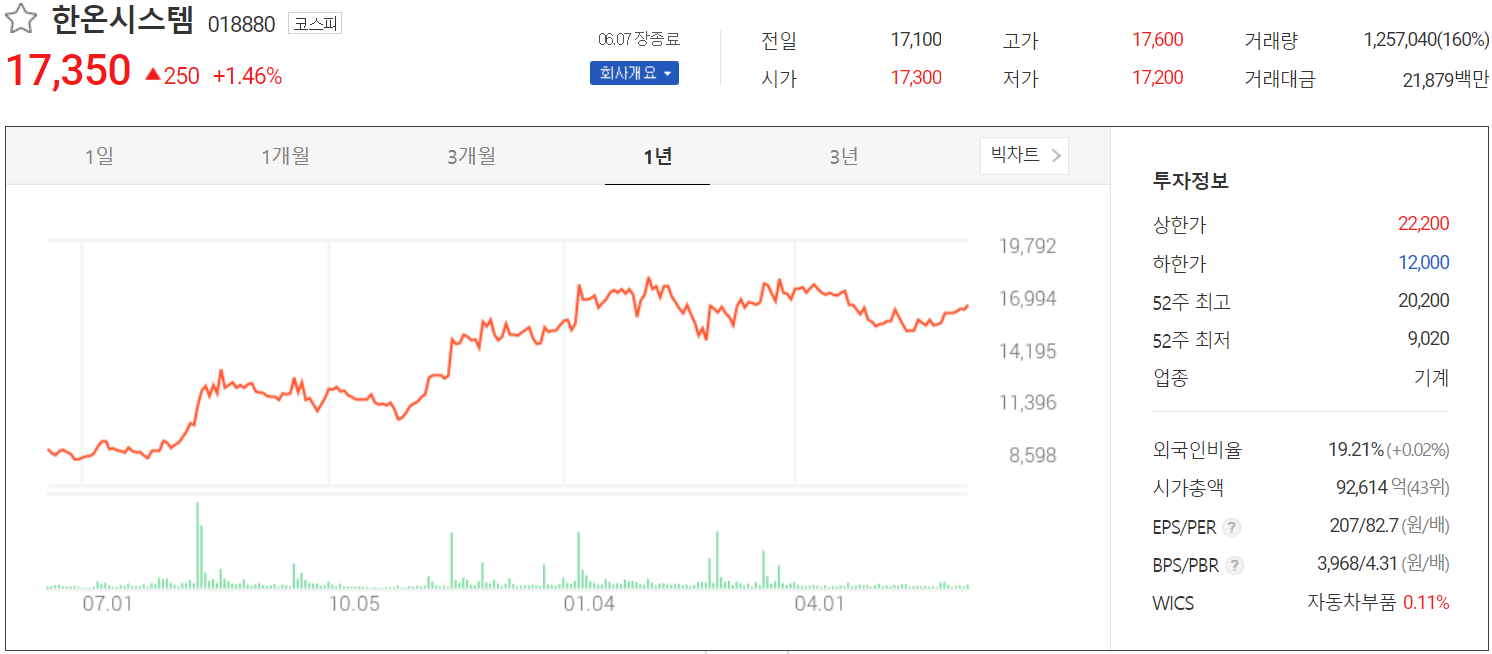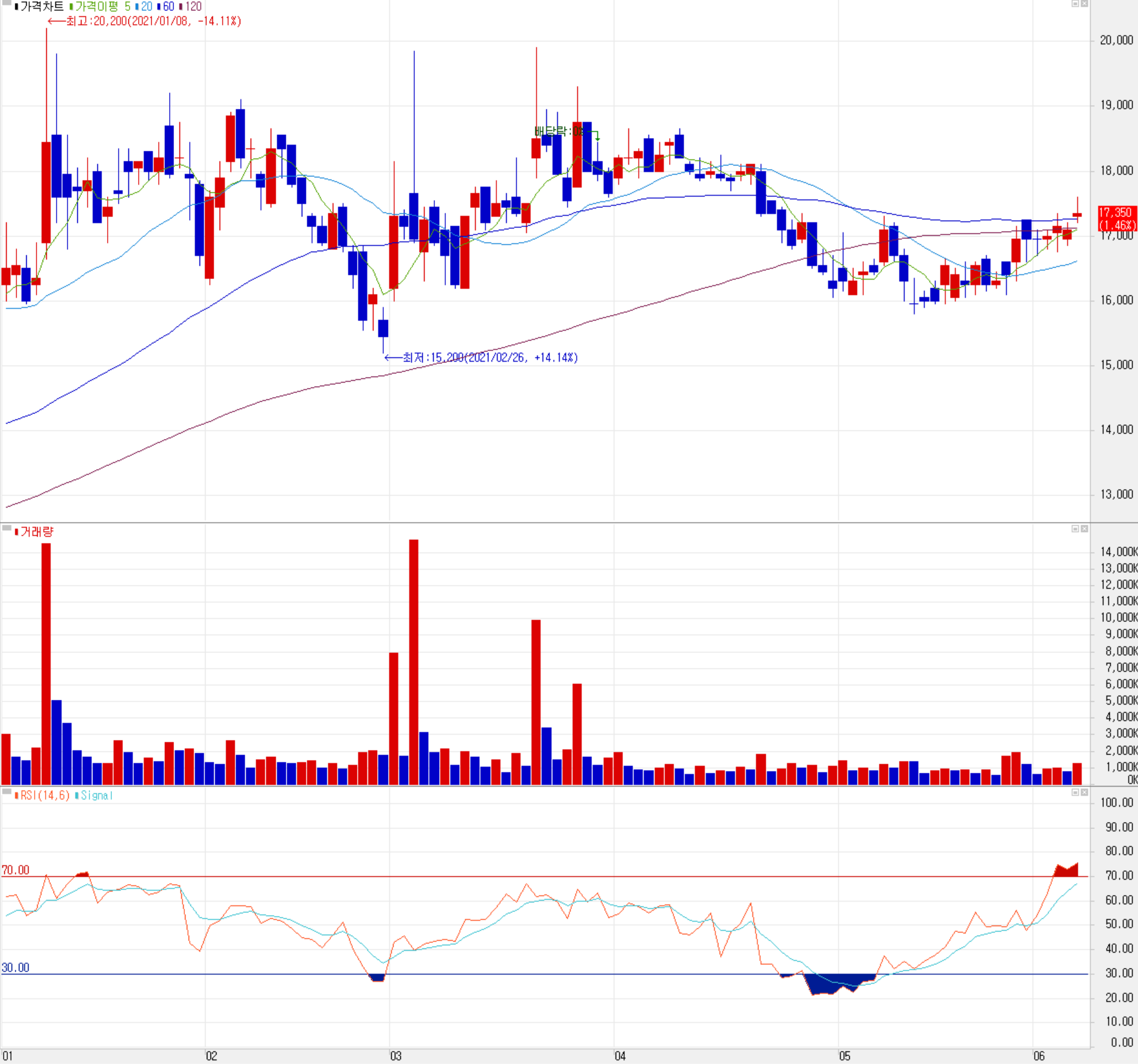 6월 7일 장 종료 기준 당사의 주가는 전 거래일보다 1.46% 오른 17,350원에 거래를 마쳤습니다. 외국인 비중은 19.21%이며, 시가 총액은 9조 2,614억 원으로 코스피 시총 43위 종목입니다.