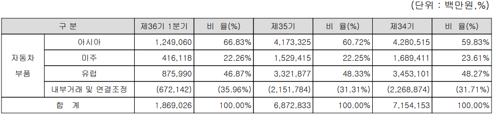 당사는 자동차용 에어컨(HVAC), 파워트레인 쿨링(PTC), 압축기(COMP), 플루이드 트랜스포트(FT) 등을 생산하는 자동차용 공조 시스템 단일 사업부문으로 되어 있습니다. 지난 1분기 실적에서 지역별 매출 현황은 아시아 1조 2,490억 원으로 전체 매출의 66.83%를 차지하였고, 미주는 4,161억 원으로 22.26% 그리고 유럽은 8,760억 원으로 46.87%의 매출 비중을 나타냈습니다.(내부 거래 조정 전)