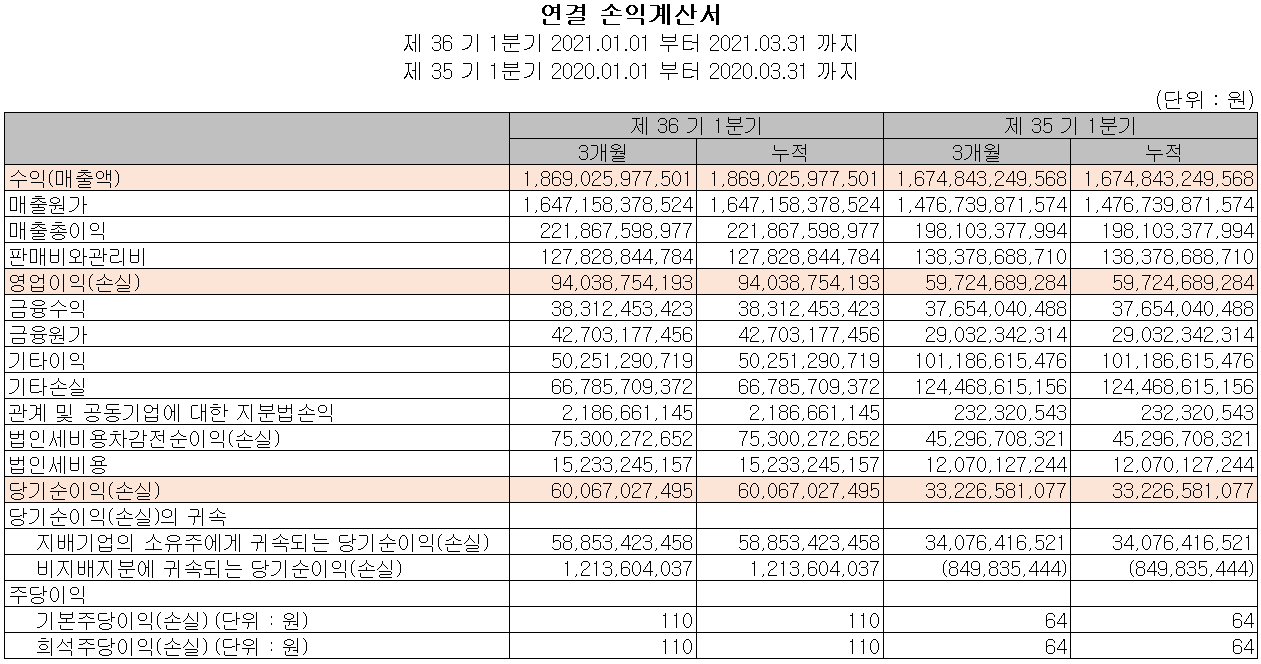 당사의 지난 1분기 실적은 매출액 1조 8,690억 원으로 전년 동기 대비 11.6% 증가했고, 영업이익은 940억 원으로 57.5% 증가, 당기순이익은 601억 원으로 80.8% 증가했습니다. 미주와 유럽의 매출은 예상치보다 하회했으나 아시아 지역의 매출이 전년 동기 대비 33% 증가하면서 전반적인 실적 상승을 이끌었습니다.