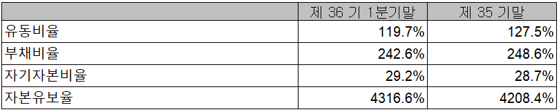 당사의 2021년 1분기 재무 안정성 비율에서는 유동비율 119.7%, 부채비율 242.6%, 자기 자본비율 29.2%, 자본 유보율 4,316.6%를 기록하였습니다.