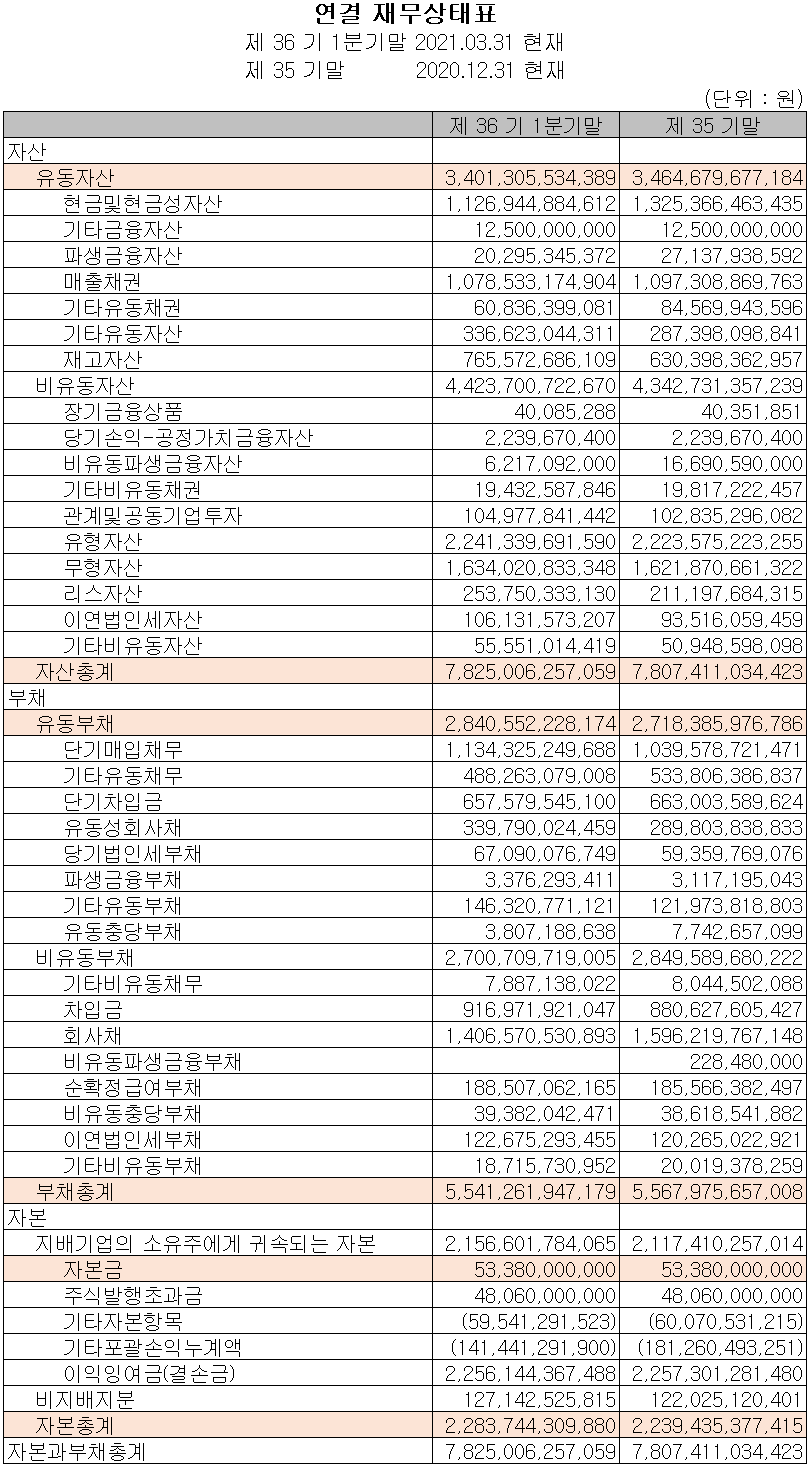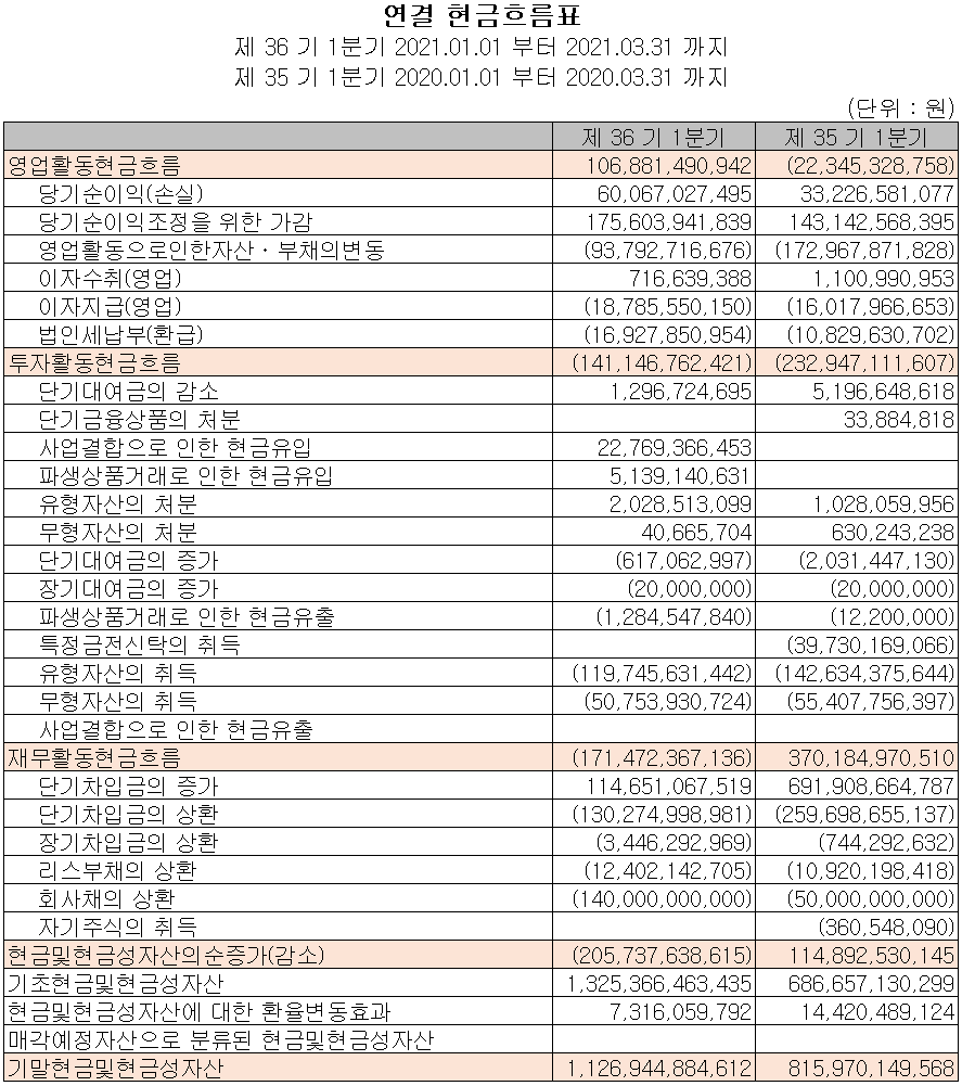 지난 1분기 영업활동 현금흐름에서는 순이익의 증가 등으로 총 1,069억 원의 현금이 유입되었으며, 차입금을 조달하여 부채를 상환하고 유무형 자산에 투자했습니다. 2021년 1분기 말 기준 현금 및 현금성 자산은 전년 동기보다 3,110억 원이 증가한 1조 1,269억 원입니다.