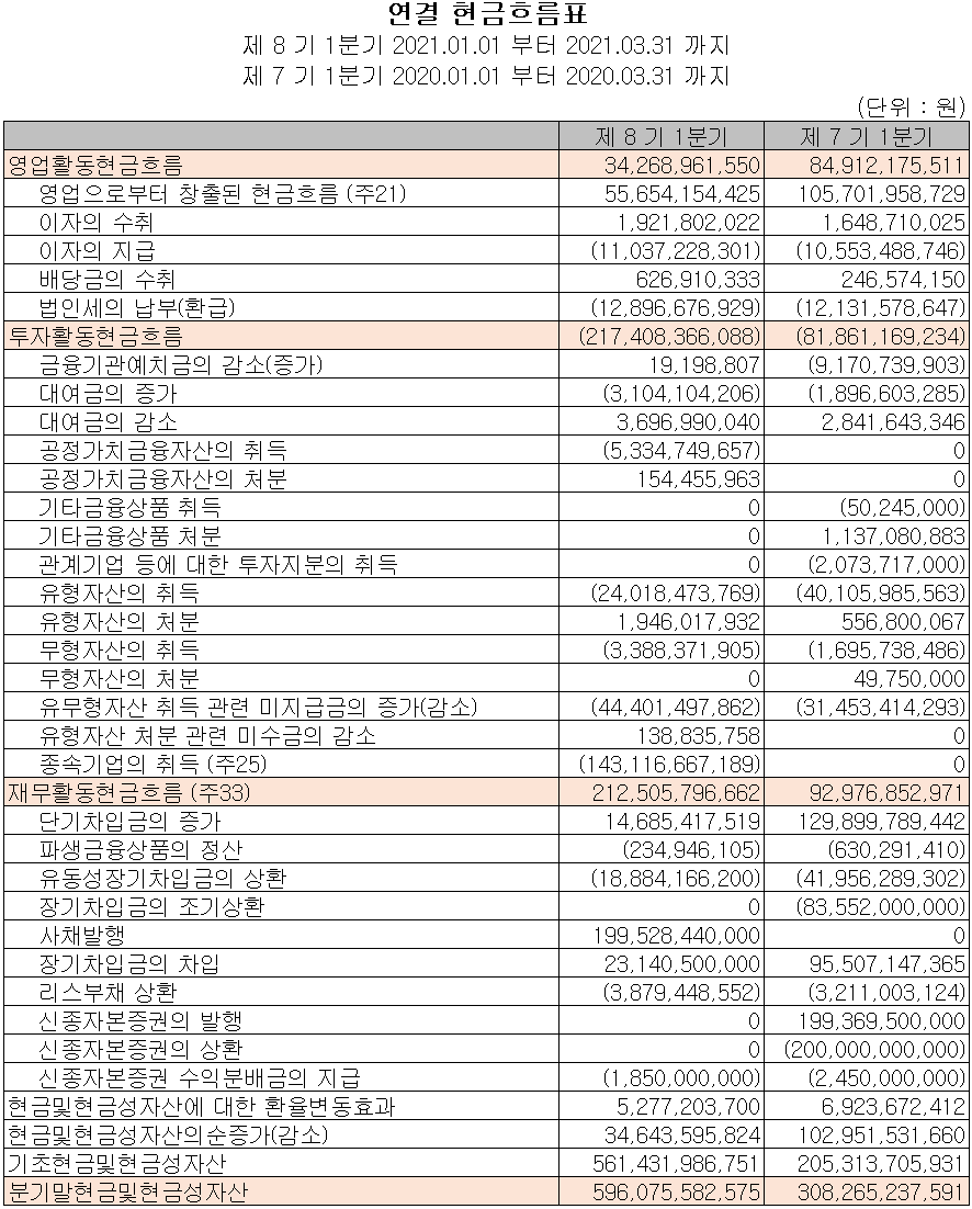 당사의 지난 1분기 영업활동 현금흐름은 운전자산의 변동에 따라 총 343억 원의 현금이 유입되었으며, 차입금 및 사채 발행을 통하여 자금을 조달하고 부채를 상환하였고, 유무형 자산의 취득을 지속하였습니다. 2021년 1분기 말 기준 현금 및 현금성 자산은 5,961억 원으로 전년 동기 대비 2,878억 원이 증가하였습니다.