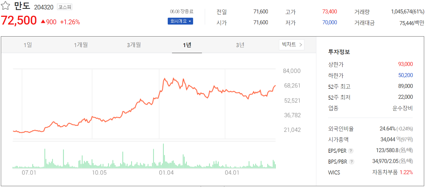 6월 8일 장 종료 기준 당사의 주가는 전일보다 1.26% 오른 72,500원에 거래를 마감했습니다. 외국인 비중은 24.64%이며, 시가 총액 3조 4,044억 원으로 코스피 시총 상위 97위 종목입니다.