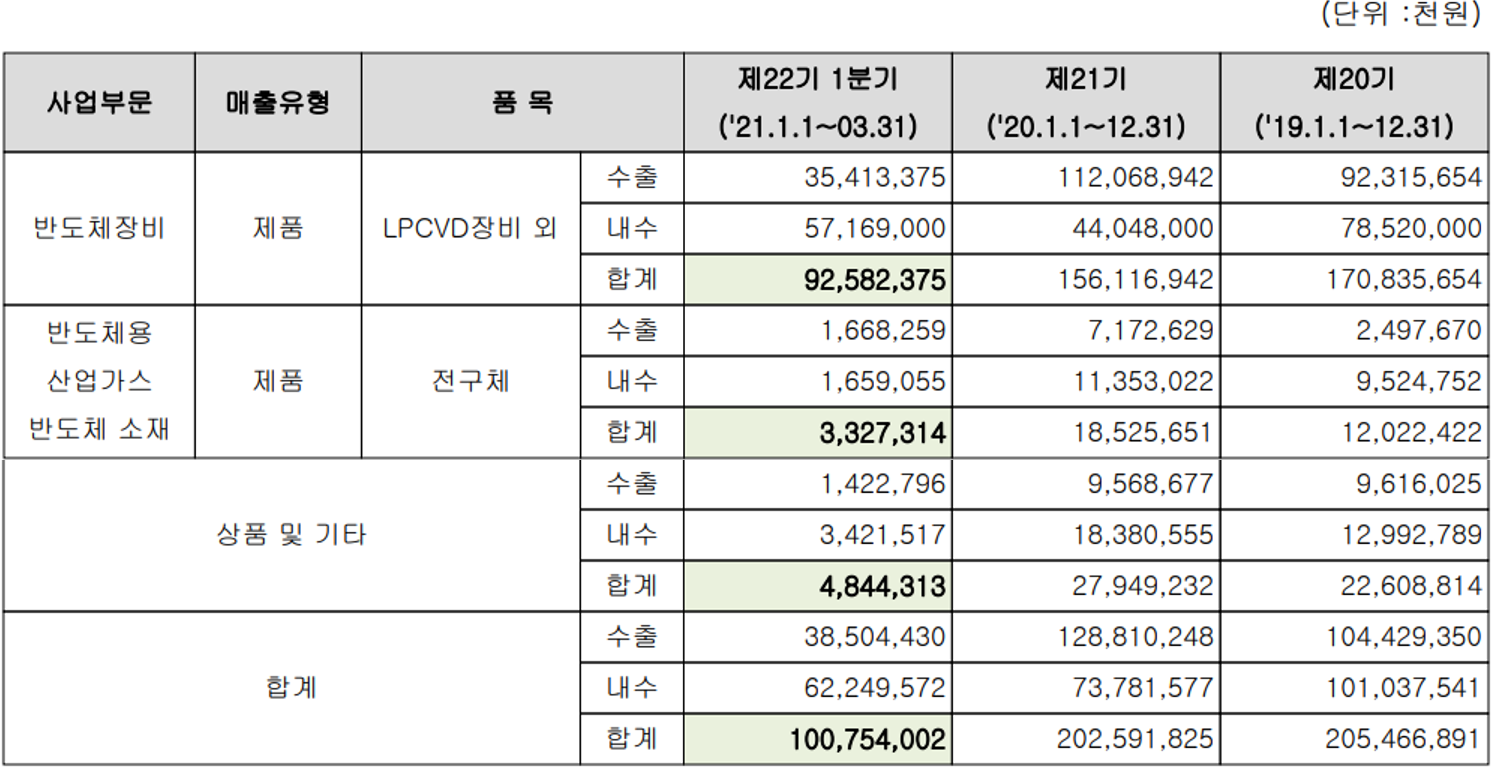 당사는 반도체 제조 공정 중 웨이퍼에 박막 형성 재료를 화학반응에 의해 웨이퍼 상에 박막을 형성하는 장비와 박막 증착 시 사용되는 화학물질을 제조, 공급하는 사업을 주력으로 하고 있습니다. 지난 1분기 반도체 장비 부문의 매출액은 926억 원으로 전체 매출의 91.9%를 차지하였으며, 증착용 소재인 전구체의 매출은 48억 원으로 4.8%의 매출 비중을 나타냈습니다.