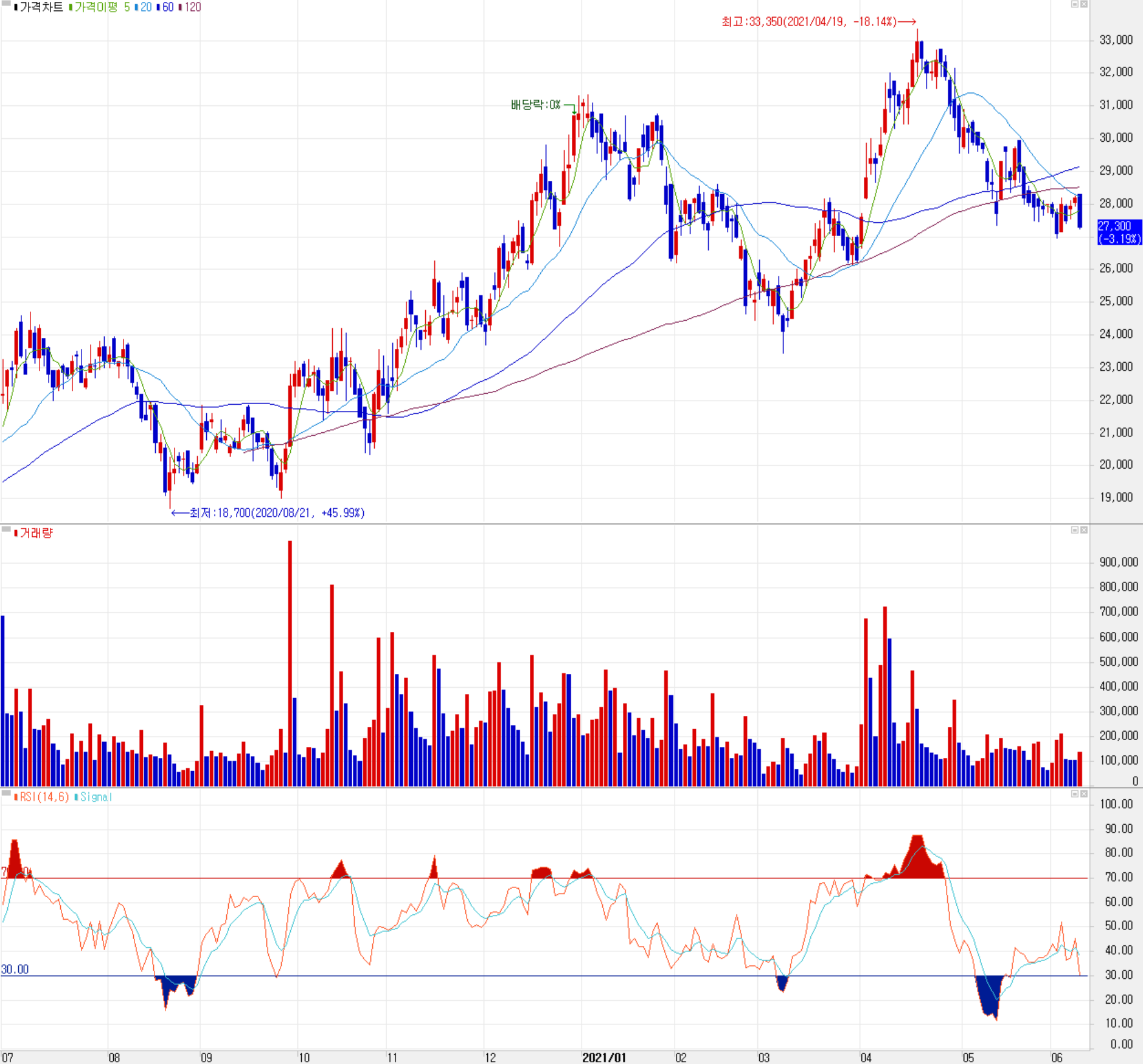 6월 9일 장종료 기준 당사의 주가는 전일보다 3.19% 내린 27,300원에 거래를 마쳤습니다. 외국인 비중은 11.39%이며, 시가 총액 5,695억 원으로 코스피 시총 329위 종목입니다.