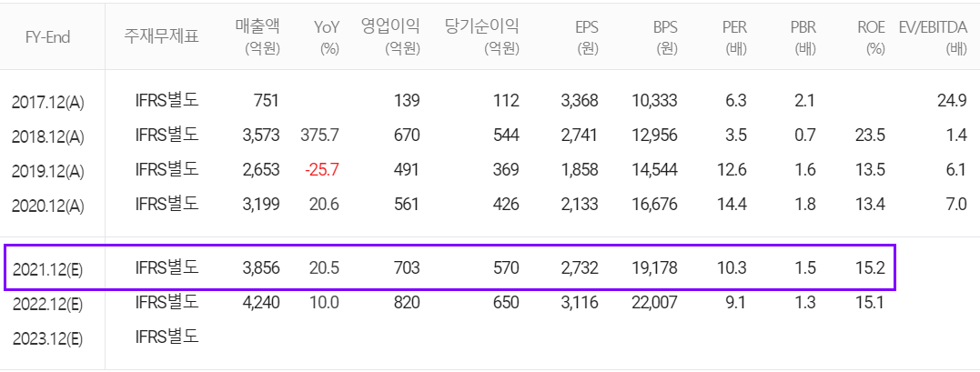 당사의 2021년 연간 컨센서스는 매출액 3,856억 원으로 전년 대비 20.5% 증가하고, 영업이익은 703억 원으로 25.3% 증가할 것으로 추정했습니다.