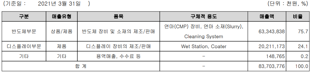 당사는 반도체 및 디스플레이 공정용 장비의 제조 및 연마 소재인 CMP Slurry의 제조, 공급을 주력으로 하는 기업입니다. 지난 1분기 반도체 부문의 매출은 633억 원으로 전체 매출의 75.7%를 차지하였으며, 디스플레이 부문의 매출은 202억 원으로 24.1%의 매출 비중을 기록했습니다.