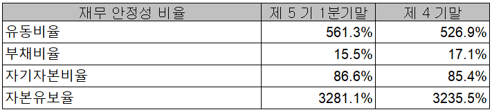 2021년 1분기 당사의 재무 안정성 비율에서는 유동비율 561.3%, 부채비율 15.5%, 자기자본비율 86.6%, 자본 유보율 3,281.1%를 기록하면서 건실하고 안정적인 재무상태를 유지하고 있습니다.
