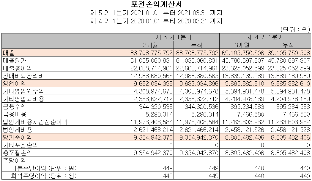 2021년 2분기 예상 실적은 매출액 1,039억 원으로 전년 동기 대비 28.7% 증가하고, 영업이익은 227억 원으로 41.8% 증가할 것으로 내다봤습니다.