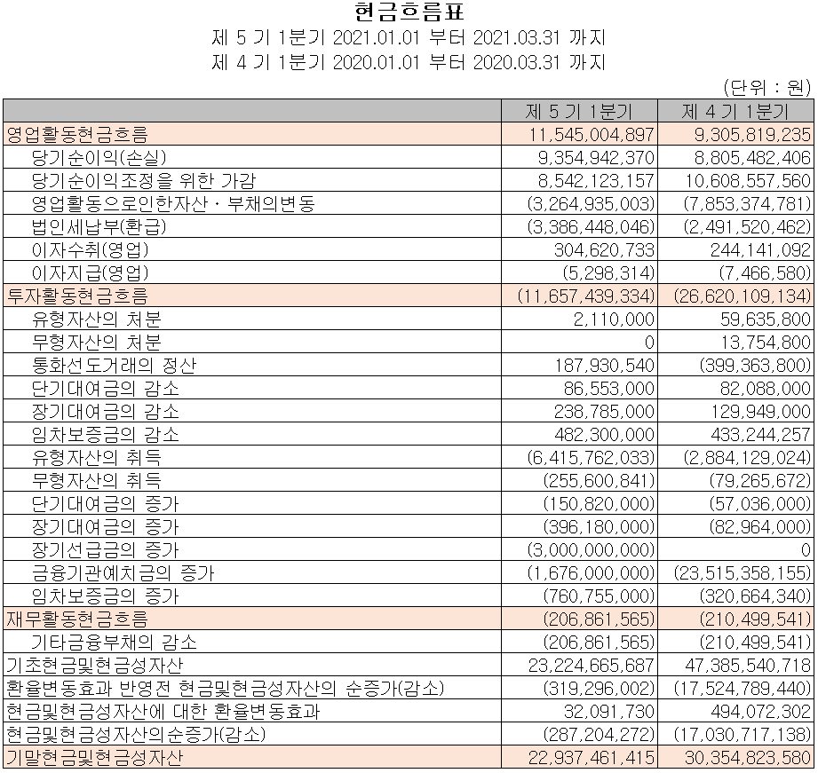 당사의 지난 1분기 영업활동 현금흐름에서는 순이익의 증가 및 운전 자산의 변동 등으로 총 115억 원의 현금이 유입되었으며, 유형자산의 취득 및 장기 선급금의 증가 등에 따라 투자활동 현금흐름에서는 116억 원의 현금이 유출되었습니다. 2021년 1분기 말 기준 당사의 현금 및 현금성 자산은 전년 동기보다 74억 원 줄어든 229억 원을 보유하고 있습니다.