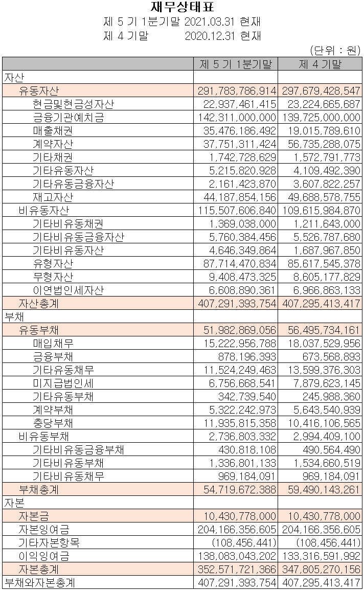 지난 1분기 자산 총계는 전기보다 소폭 감소하면서 유사한 수준인 4,073억 원이며, 부채는 8% 감소한 547억 원으로 매입채무 및 유동채무의 감소에 따른 것입니다. 이익의 증가에 따라 전체 자본도 1.4% 증가한 3,526억 원을 기록했습니다.
