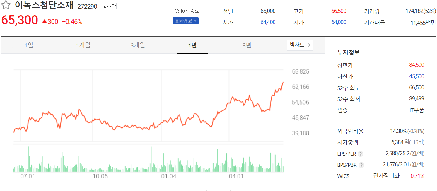 6월 10일 장 종료 기준 당사의 주가는 전일보다 0.46% 오른 65,300원에 거래를 마쳤습니다. 외국인 비중은 14.3%이며, 시가총액 6,384억 원으로 코스닥 시총 상위 116위 종목입니다.