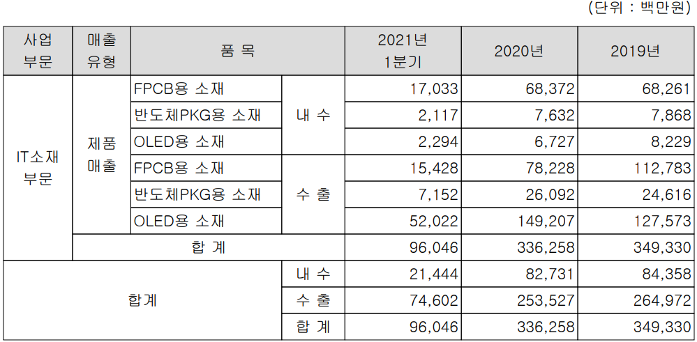 당사는 신소재의 융복합 기술을 바탕으로 FPCB, 반도체 패키징 그리고 OLED 디스플레이 제조 공정에 적용되는 핵심 소재를 제조, 공급하고 있습니다. 지난 1분기 FPCB(연성 회로 기판)의 매출액은 325억 원으로 전체 매출의 33.8%를 차지하였으며, 반도체 패키지용 소재 부문에서는 93억 원의 매출로 0.65% 그리고 OLED 소재 부문에서는 543억 원의 매출로 56.55%의 매출 비중을 기록했습니다.