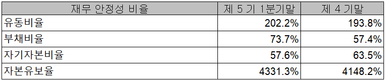 당사의 2021년 1분기 재무 안정성 비율에서는 유동비율 202.2%, 부채비율 73.7%, 자기 자본비율 57.6%, 자본 유보율 4,331.3%를 기록하면서 양호한 재무구조를 유지하고 있습니다.