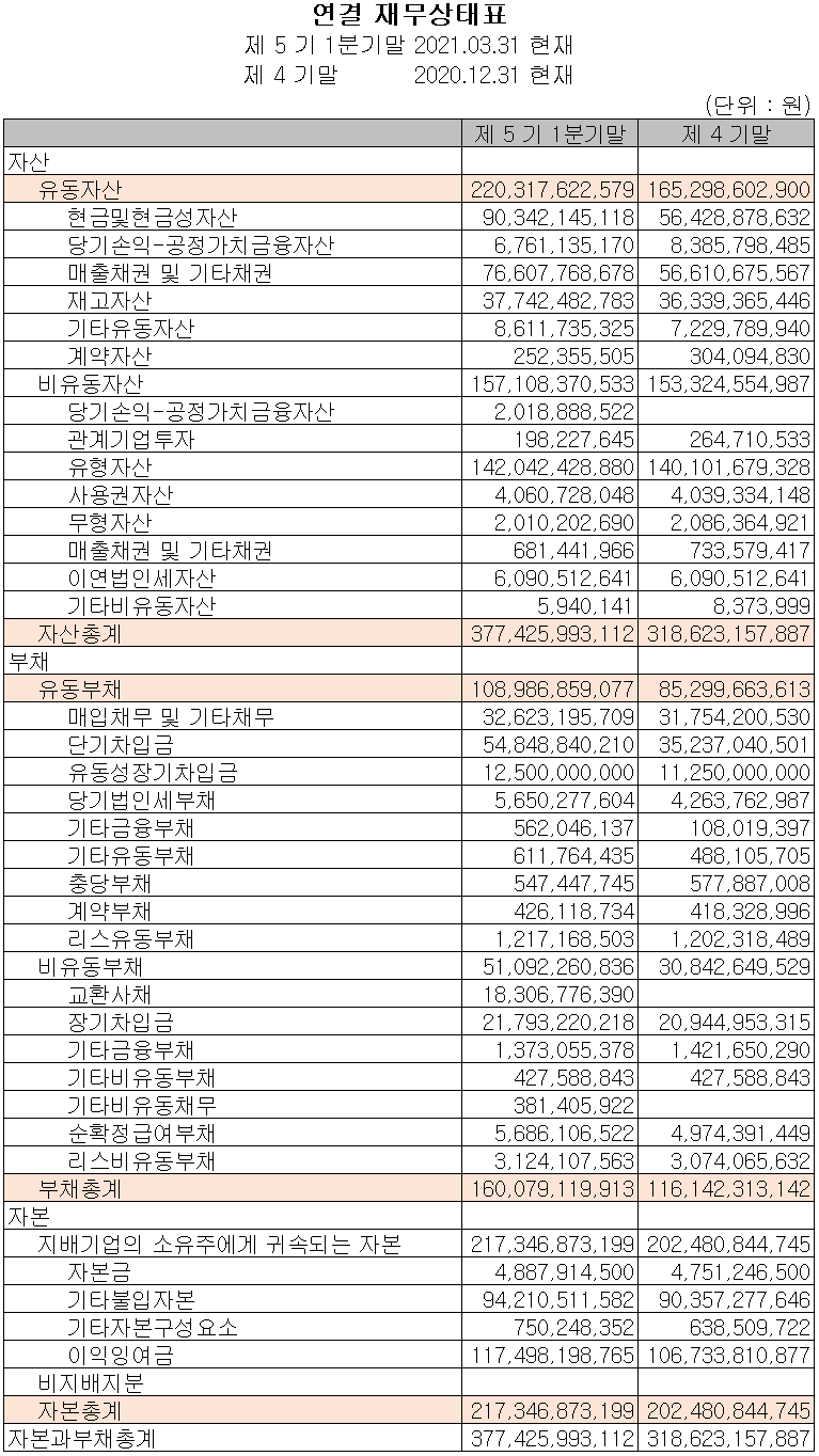 지난 1분기 자산 총계는 전기보다 18.5%(588억 원) 증가한 3,774억 원으로 현금 및 현금성 자산과 매출 채권의 증가가 있었습니다. 부채 총계는 37.8%(439억 원) 증가한 1,600억 원으로 차입금 및 교환사채에 기인합니다.
