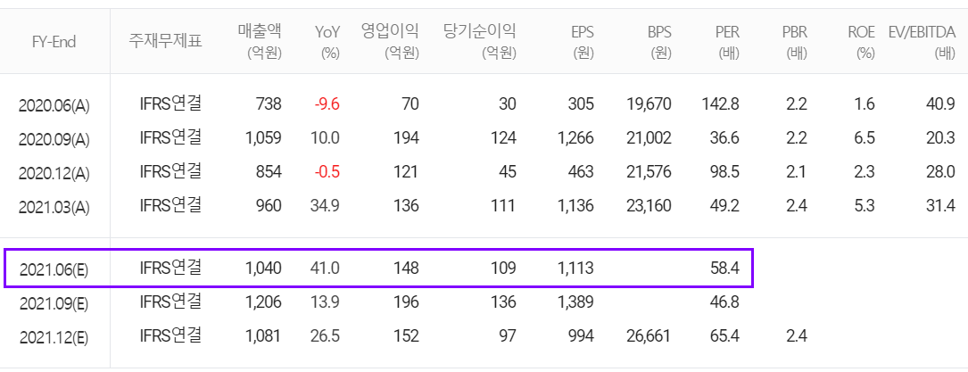 2021년 2분기 예상 실적은 매출액 1,040억 원으로 전년 동기 대비 41% 증가하고, 영업이익은 148억 원으로 111.4% 증가할 것으로 내다봤습니다.