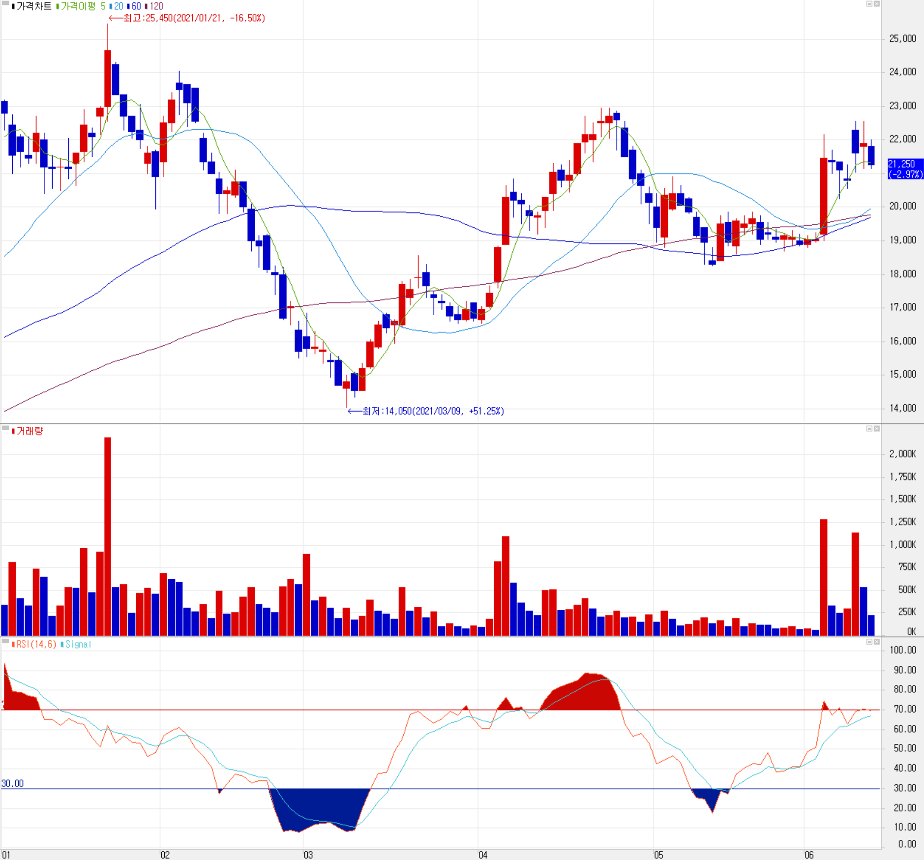 6월 11일 장 종료 기준 당사의 주가는 전일보다 2.97% 내린 21,250원에 거래를 마감했습니다. 외국인 비중은 10.15%이며, 시가 총액 3,804억 원으로 코스피 시총 사위 431위 종목입니다.