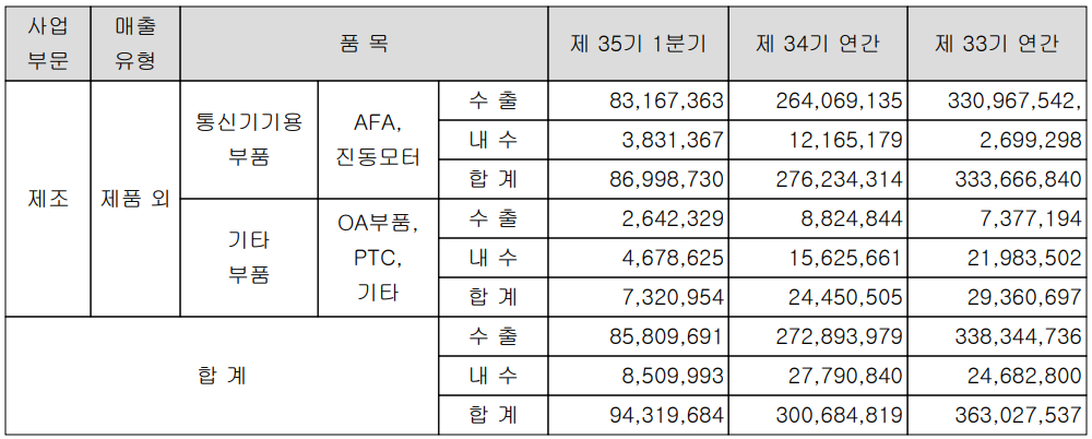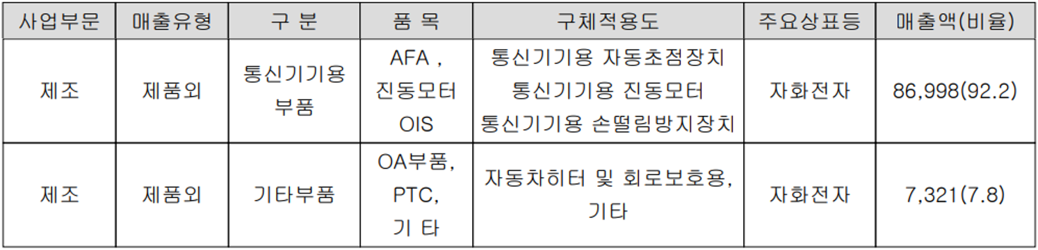 당사는 원천 기술인 자기 엔지니어링을 기반으로 스마트폰 등 통신기기용 자동 초점 장치, 진동 모터, 손떨림 방지 장치 등과 기타 자동차 전장용 PTC 히터 등을 제조, 공급하고 있습니다. 지난 1분기 통신 기기용 부품 부문의 매출은 870억 원으로 전체 매출의 92.2%를 기록했고, 기타 자동차 PTC 히터 등에서 73억 원의 매출로 7.8% 비중을 나타냈습니다.
