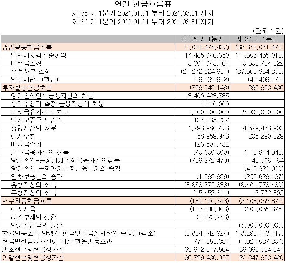 지난 1분기 영업활동 현금흐름에서는 매출 채권 및 재고 자산 등의 변동으로 운전자산이 조정되어 총 30억 원의 현금이 유출되었으며, 차입금을 상환하고 이자를 지급하였습니다. 또한 생산능력 증대를 위해 유무형 자산을 취득하면서 투자활동에서는 총 7.4억 원의 현금이 유출되었습니다.