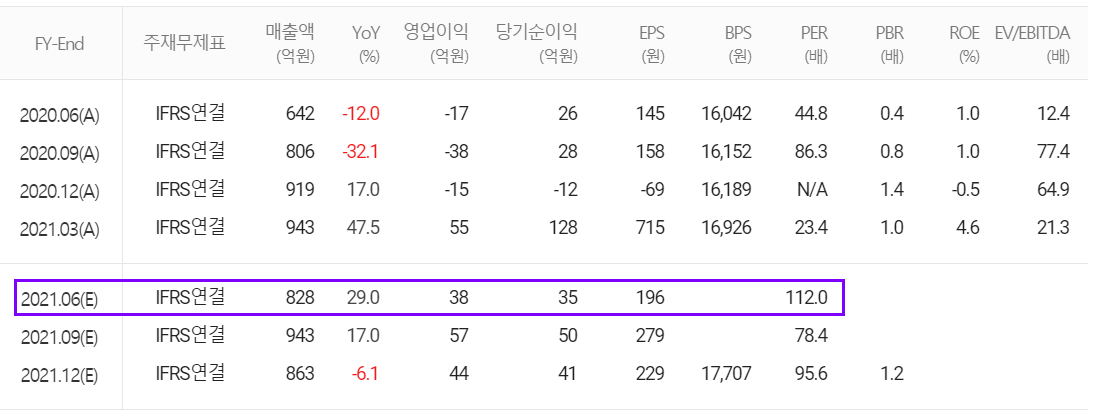 당사의 2021년 2분기 예상 실적은 매출액 828억 원으로 전년 동기 대비 29% 증가하고, 영업이익은 38억 원으로 흑자 전환할 것으로 전망했습니다.