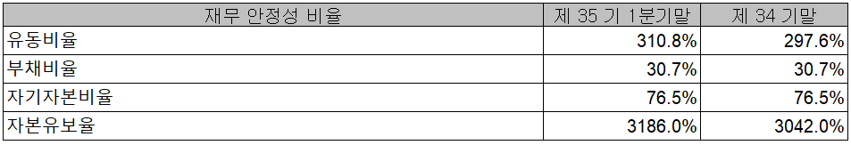 당사의 2021년 1분기 재무 안정성 비율에서는 유동비율 310.8%, 부채비율 30.7%, 자기 자본비율 76.5%, 자본 유보율 3,186%를 기록하면서 건실하고 안정적인 재무상태를 유지하고 있습니다.