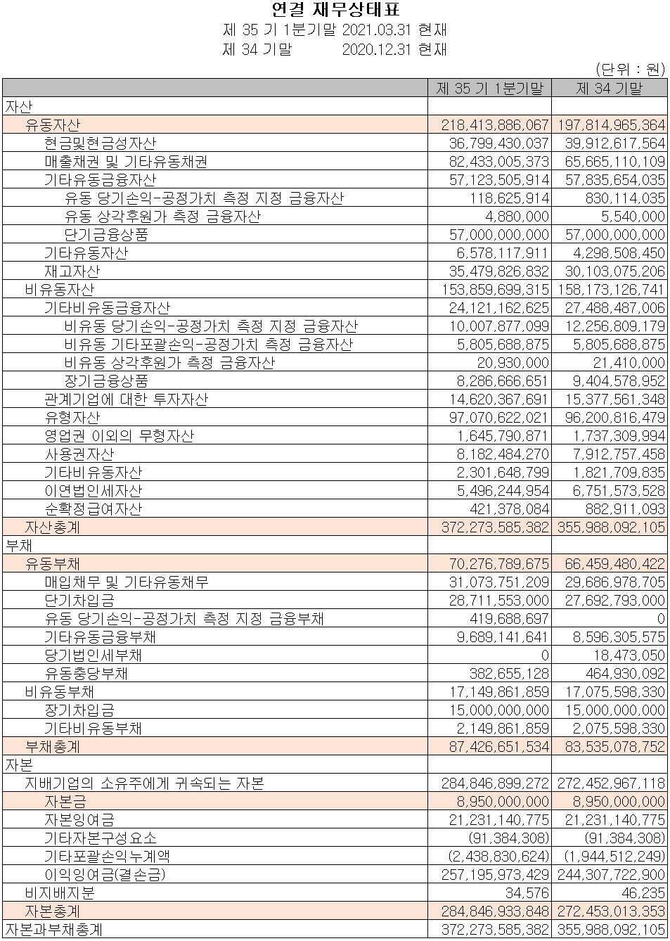 당사의 지난 1분기 말 기준 자산총계는 전기보다 4.6%(163억 원) 증가한 3,723억 원으로 유동성 금융자산과 재고 자산의 증가에 기인합니다. 부채 총계는 4.7%(39억 원) 증가한 874억 원으로 매입채무 및 차입금의 증가가 있었습니다.