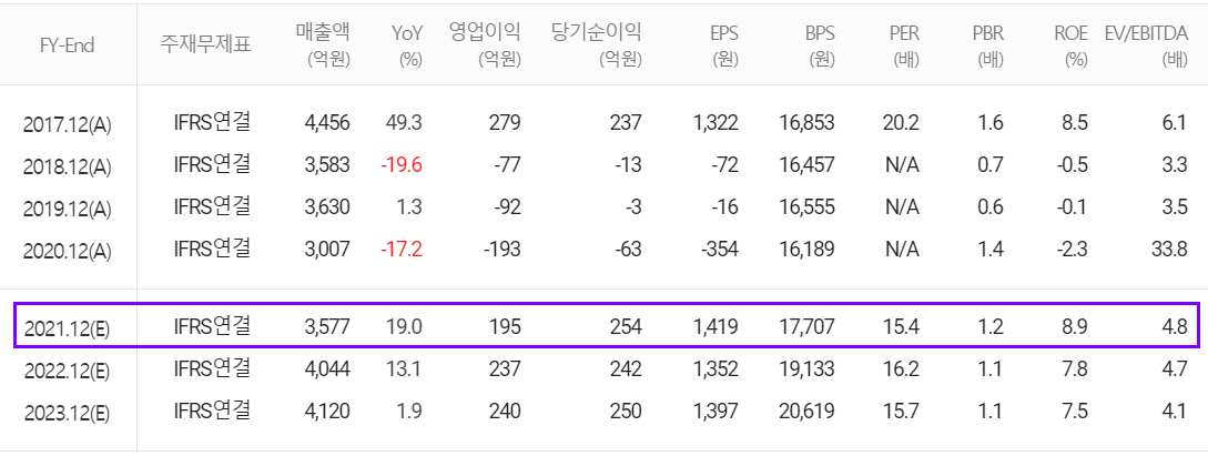 당사의 2021년 연간 예상 실적에서는 매출액 3,577억 원으로 전년 대비 19% 증가하고, 영업이익은 195억 원, 당기순이익 254억 원으로 흑자 전환할 것으로 추정했습니다.