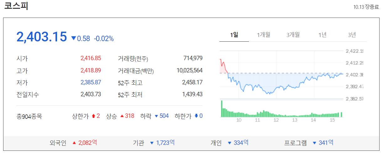 오늘 코스피 시장은 0.58포인트(0.02%)하락한 2403.15에 마감했습니다.