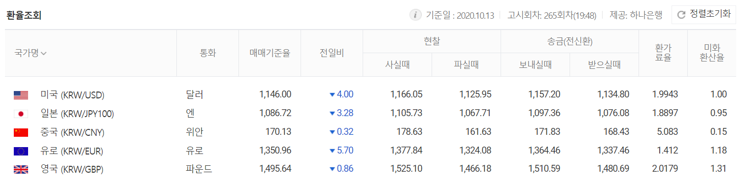 유로 환율도 전일 대비 5.70원 하락한 1350.96원을 기록했습니다. (하나은행 265회차 고시)