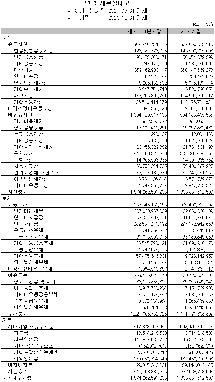당사의 지난 1분기 말 기준 자산 총계는 전기보다 3.9%(704억 원) 증가한 1조 8,743억 원이며, 부채 총계는 4.7%(553억 원) 증가한 1조 2,271억 원을 기록했습니다.