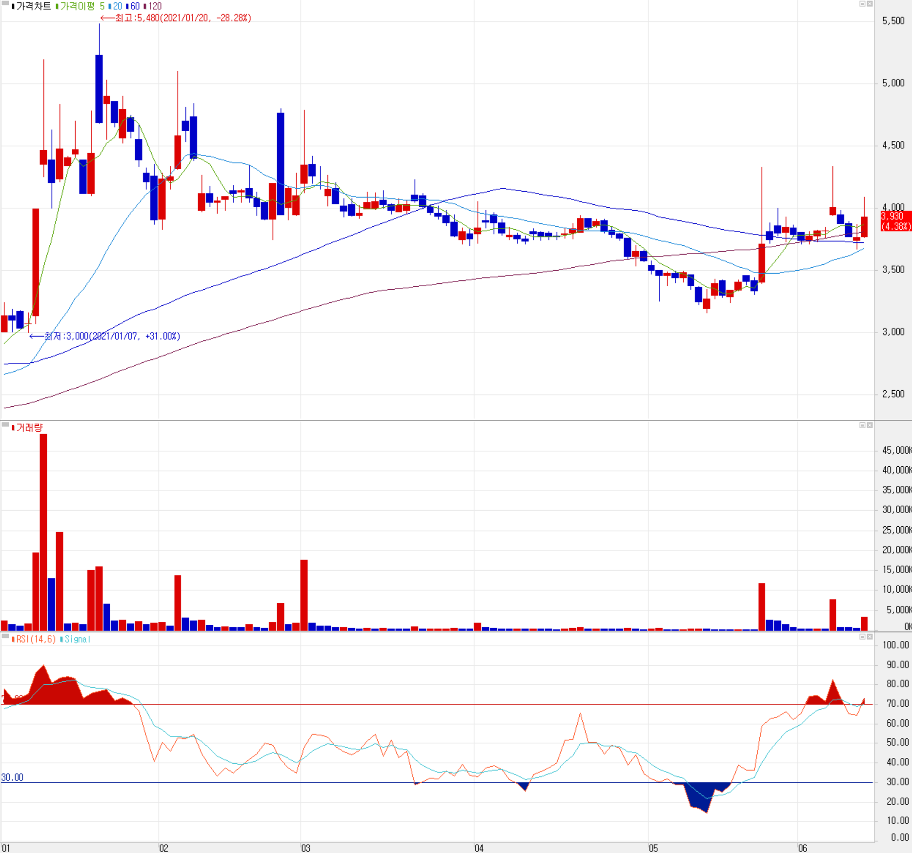 6월 11일 장 종료 기준 당사의 주가는 전 거래일보다 4.38% 오른 3,930원에 거래를 마감했습니다. 외국인 비중은 1.04%이며, 시가 총액 1,181억 원으로 코스닥 시총 852위 종목입니다.