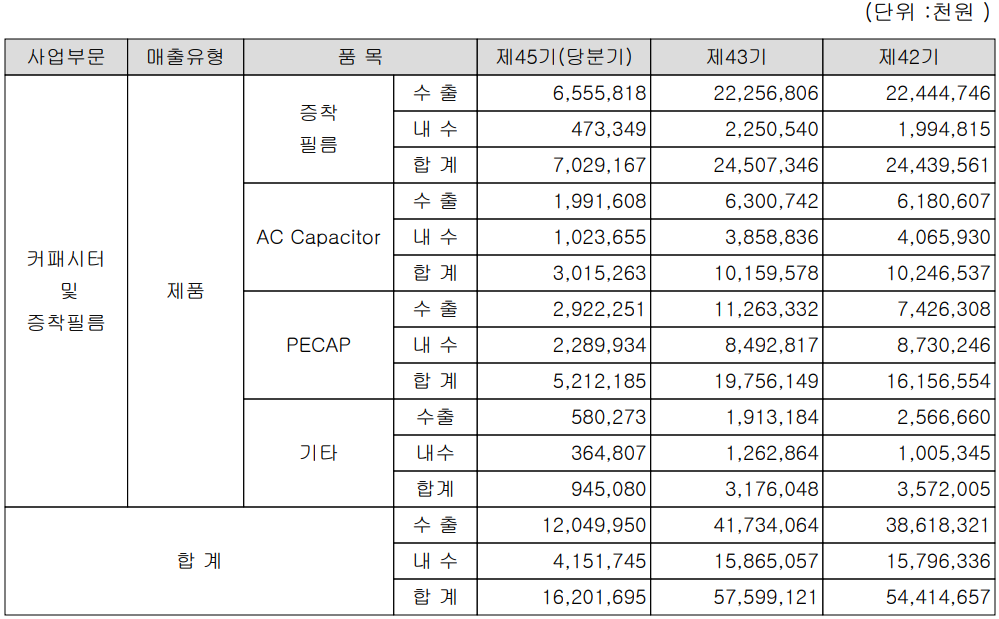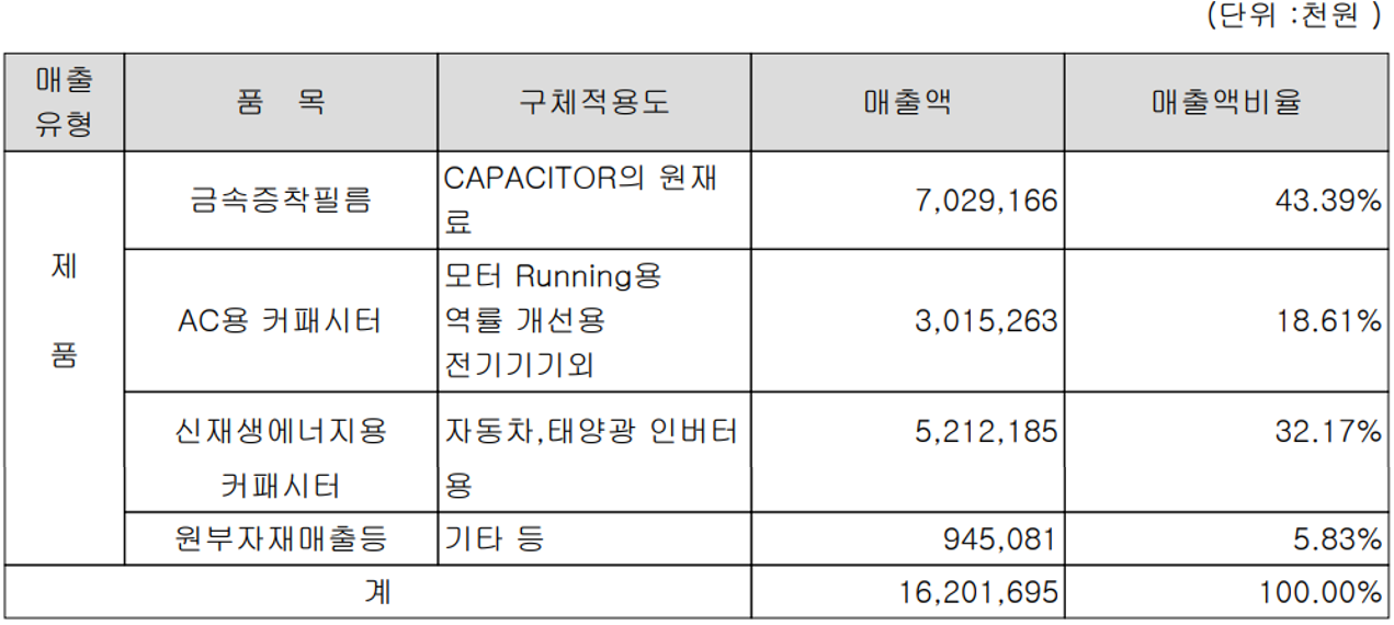 당사는 커패시터 단일 사업부문을 영위하고 있으며, 커패시터의 핵심 소재인 금속증착필름과 AC(교류)용 커패시터, 신재생에너지용 커패시터 등의 제품으로 구성되어 있습니다. 지난 1분기 금속증착필름의 매출은 70억 원으로 전체 매출의 43.39%를 차지하였으며, 친환경 차량용 및 태양광 인버터용 커패시터는 매출액 52억 원으로 32.17%의 매출 비중을 보였습니다.