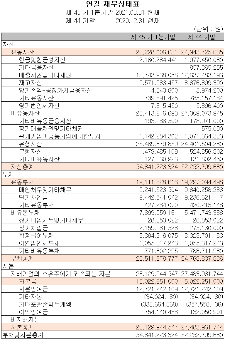 지난 1분기 말 기준 자산 총계는 전기보다 4.6%(24억 원) 증가한 546억 원으로 매출채권과 유형자산의 증가에 기인합니다. 부채 총계는 7%(17억 원) 증가한 265억 원으로 차입금의 증가가 있었습니다.