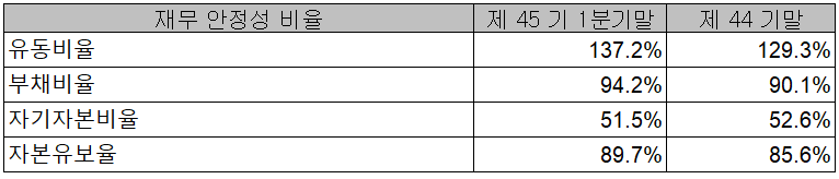 당사의 2021년 1분기 재무 안정성 비율에서는 유동비율 137.2%, 부채비율 94.2%, 자기 자본비율 51.5%, 자본 유보율 89.7%를 기록했습니다. 10년을 넘게 친환경용 커패시터의 개발에 힘써오면서 비용 부담이 컸으나 부채비율도 감소 추세이며, 이익규모도 점차 개선되는 모습을 보이면서 전반적인 재무상태도 나아지는 모습입니다.
