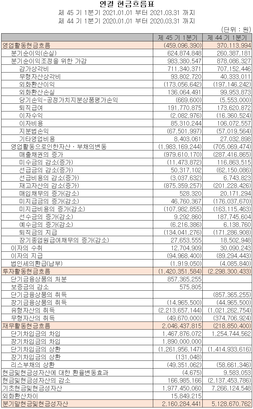 당사의 2021년 1분기 영업활동 현금흐름에서는 총 4.6억 원의 현금이 유출되었으며, 재무활동에서는 장단기 차입금의 조달을 통해 부채를 상환하고, 유무형 자산을 취득하였습니다. 2021년 1분기 말 기준 현금 및 현금성 자산은 22억 원을 보유하고 있습니다.