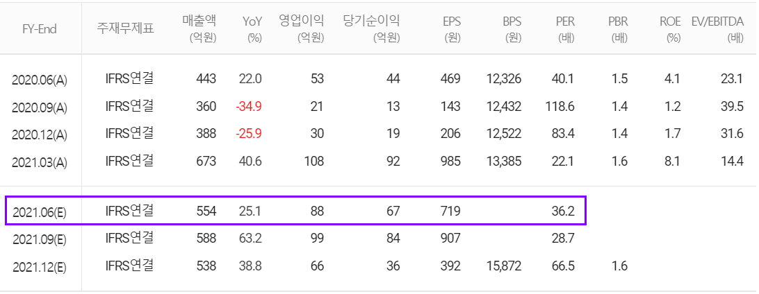 2021년 2분기 컨센서스는 매출액 554억 원으로 전년 대비 25.1% 증가하고, 영업이익은 88억 원으로 66% 증가할 것으로 내다봤습니다.