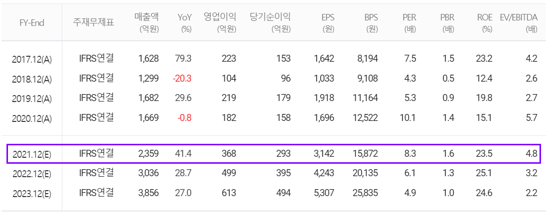 당사의 2021년 연간 예상 실적에서는 매출액 2,359억 원으로 전년 대비 41.4% 증가하고, 영업이익은 368억 원으로 102.2% 증가할 것으로 추정하면서 사상 최대 실적을 거둘 것으로 전망했습니다.