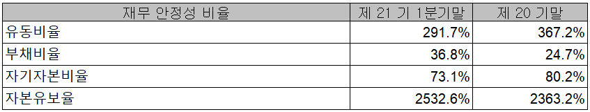 당사의 2021년 1분기 재무 안정성 비율에서는 유동비율 291.7%, 부채비율 36.8%, 자기자본비율 73.1%, 자본 유보율 2,532.6%를 기록하면서 건실하고 안정적인 재무상태를 유지하고 있습니다.