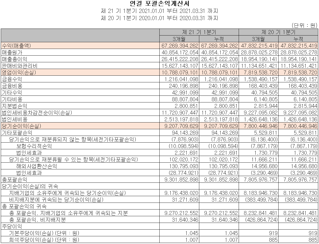 당사의 2021년 연간 예상 실적에서는 매출액 2,359억 원으로 전년 대비 41.4% 증가하고, 영업이익은 368억 원으로 102.2% 증가할 것으로 추정하면서 사상 최대 실적을 거둘 것으로 전망했습니다.