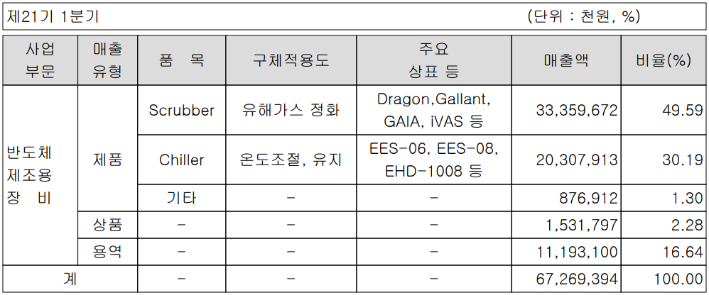 당사는 반도체 및 디스플레이 제조 공정에서 발생하는 유해가스를 정화하는 스크러버(Scrubber)와 온도제어 및 유지를 해주는 칠러(Chiller) 장비의 제조 및 공급하는 기업입니다. 지난 1분기 스크러버의 매출은 334억 원으로 전체 매출의 49.59%를 기록하였으며, 칠러는 203억 원으로 30.19%의 매출 비중을 기록했습니다.